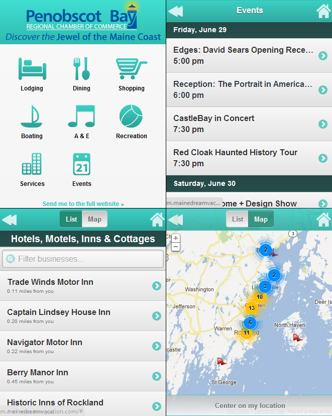 The local Chamber of Commerce asked us to continue development of their website by providing a mobile version of their directory of businesses and events. We proceeded forward, using Jquery Mobile to develop an HTML5 mobile site of their content.  The crowning feature of this site is that it will detect a user's location to provide map views and sorted lists for businesses and events nearby to the visitor, as well as easy methods to filter the list of businesses.  http://m.mainedreamvacation.com