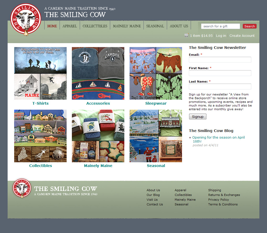 We rebuilt The Smiling Cow's website to feature products, blogs, and newsletters in a much more up-to-date fashion.  It sports a full-featured ecommerce suite, integrating with USPS for shipping and authorize.net for payment processing.  It also integrates with Constant Contact for email marketing. www.smilingcow.com.